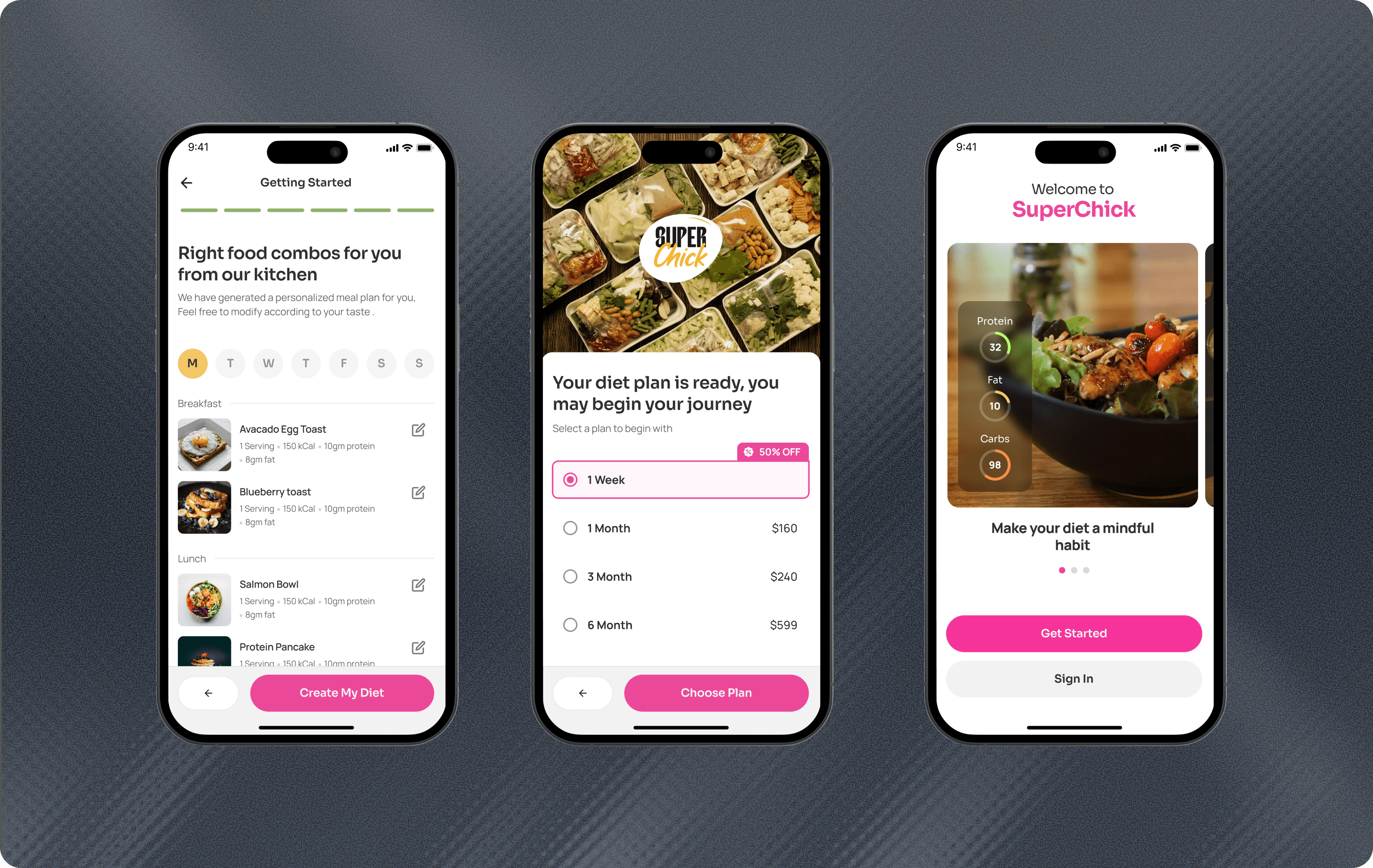 SuperChick is an AI-powered nutrition platform built to make personalized meal planning feel simple and subscription-friendly. We created the brand identity and designed the app experience end to end, shaping the visual system, core UX flows, and interface structure around clarity, trust, and daily usability. The work included a scalable Figma design system, interactive prototypes, and developer-ready assets, giving the client a strong product foundation for rollout, feature expansion, and future partnerships.